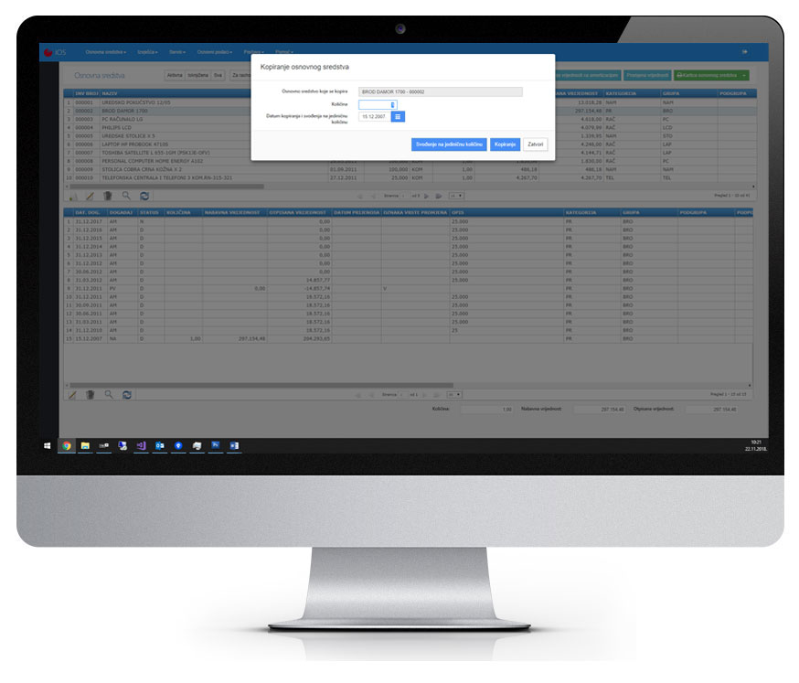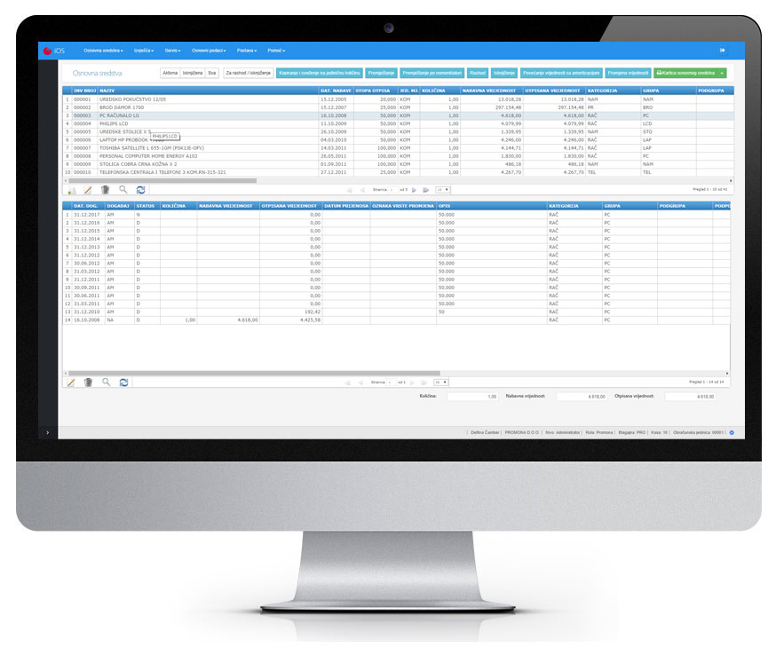 Aplikacija za praćenje osnovnih sredstava osigurava uvid u nabavu, amortizaciju (i revalorizaciju), inventuru, rashod i isknjiženje osnovnih sredstava.